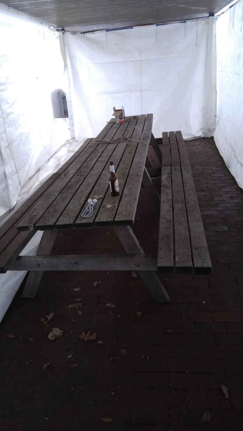 Gleich nach der Ankunft bauen wir uns einen Wind- und Regenschutz:
