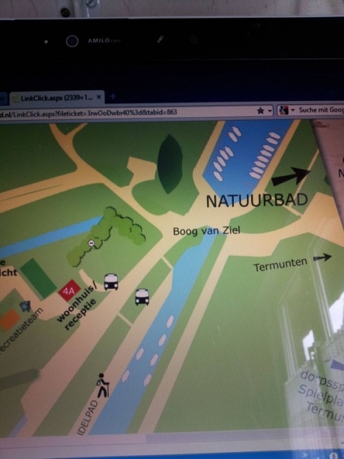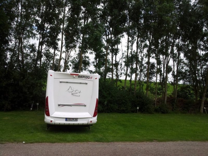 Wer weniger Zeit hat oder diese schmalen Straßen meiden möchte, wählt die Route zunächst Richtung Delfzijl und nimmt die Autobahnabfahrt Scheemda. Die Abzweigung nach Termunterzijl wird sogar mit einem Hinweisschild auf den Campingplatz Camping Zeestrand angekündigt. Vor dem Campingplatz befindet sich ein großer Schotterparkplatz. Übernachten ist jedoch verboten: Dort hielten wir zunächst an, um uns via Intercom (Gegensprechanlage) -siehe http://www.campingzeestrand.nl/LinkClic ... &tabid=863 anzumelden. Ich wurde gebeten mit Ausweis mich im Büro zu melden. Dort erledigte man die Formalitäten. Übrigends das Personal spricht hervorragend deutsch. Die Gebühren (Campingplatz) betragen für 2 Tage und 2 Personen 16,80 Euro plus 10,60 € für das Wohnmobil. Strom pauschal 5,80 Euro. Dann wird noch 2,20 € für die Müllentsorgung und 5 Euro Kurtaxe fällig. Somit gesamt für 2 Tage und 2 Personen= 40,40 Euro. Wir bekamen auf dem Plan die zur Auswahl stehenden Stellplätze angezeigt:Auf den Plätzen 63 bis 69 hatten wir wegen Baumbestand keinen Fernsehsatellitenempfang. Wir wählten die andere Seite – Platz 56und waren das Wochenende die einzigsten Wohnmobilisten. Neben uns gesellte sich noch ein Wohnwagenanhänger sowie einige Zelter. Alle hielten Lärm in Grenzen. Selbst eine Gruppe Jugendlicher Zelter drehte ab 22.00 Uhr die Musik leiser. *Thumbs Up*