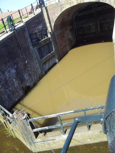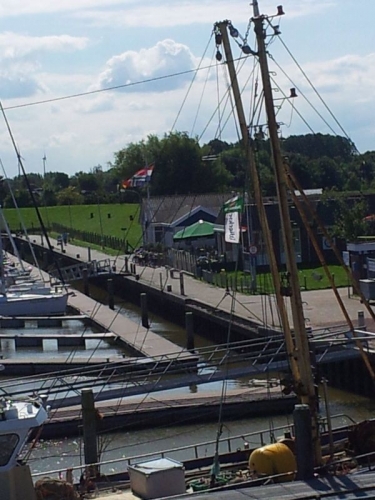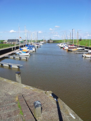 Das kleine Restaurant am Yachthafen wird in einigen Foren erwähnt, man könne dort mit dem Womo stehen. Wir entdeckten zwar eine Entsorgungsmöglichkeit für die tragbare Toilette aber nirgends einen Hinweis auf Stellplätze. Stromanschlüsse für Wohnmobile gibt es auch nicht. Ob ein Übernachten auf dem Parkplatz mit den niederländischen Gesetzen konform ist, bezweifle ich.Hier ein Blick vom Ende des Yachthafens auf das Siel.