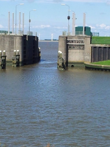 Fast direkt gegenüber dem Eingang zum Platz befindet sich ein Deichübergang und man ist dann sofort an der Emsmündung, dem Dollard. Von dort aus kann man auf der anderen Seite die Knock nebst den Windgeneratoren sehen.Hier noch ein Blick auf den Platz vom Deich aus.Auf dem Deich erreicht man nach kurzem Spazierweg die Hafeneinfahrt Termunterzijl.