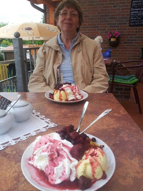 Auf unserem Rundgang durch das Dorf entdeckten wir ein Wohnhaus, welches zu einem Tee-/Kaffeestübchen umgebaut wurde. Eine Werbetafel bot die "beschwipste Oma" an. Selbstgebackener Apfelkuchen mit Eis, Sahne und eingelegten Früchten. Dieses gönnten wir uns zusammen mit Ostfriesentee.