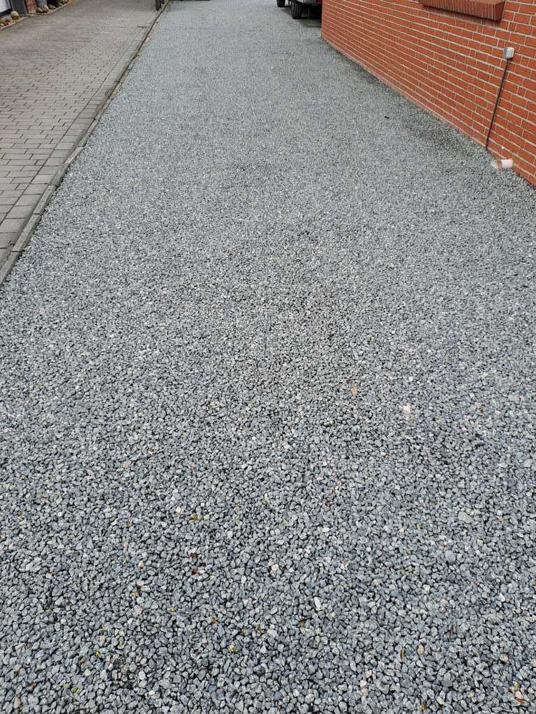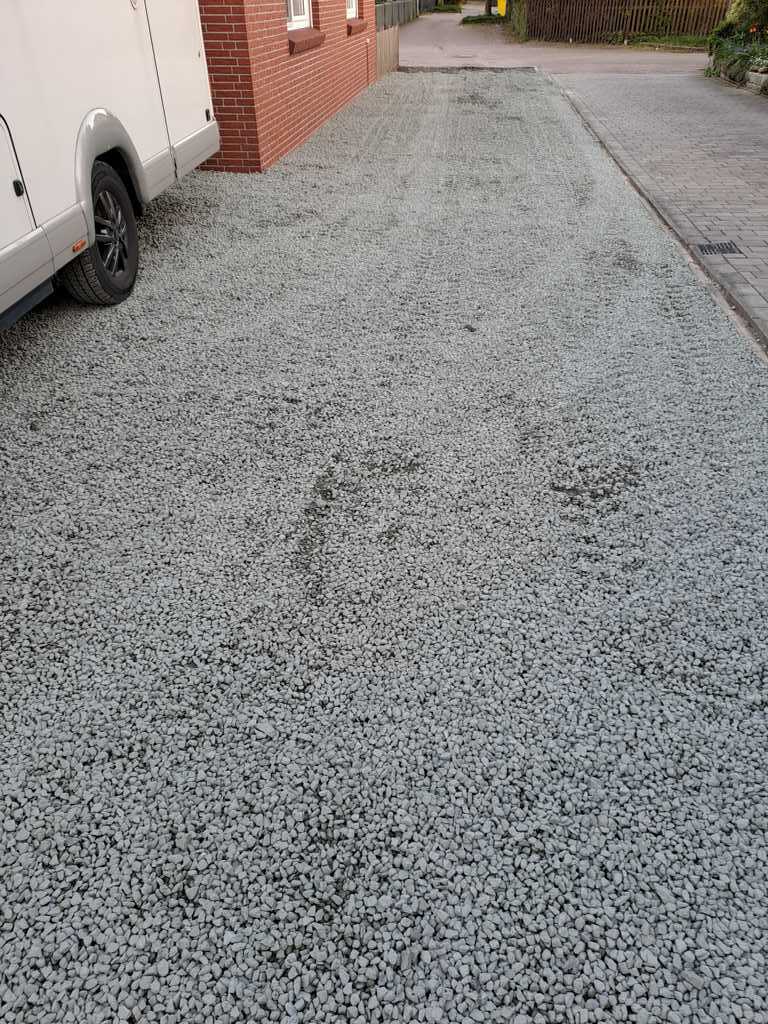 Hier sieht man den schon eingebrachten Schotter. Dieser wurde zum Zeitpunkt der Fotografie noch nicht verdichtet. Deshalb sieht man die Fahrspuren des Wohnmobils, das wieder von der Straße auf den eigenen Stellplatz gebracht wurde.