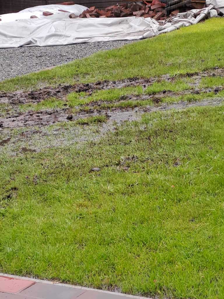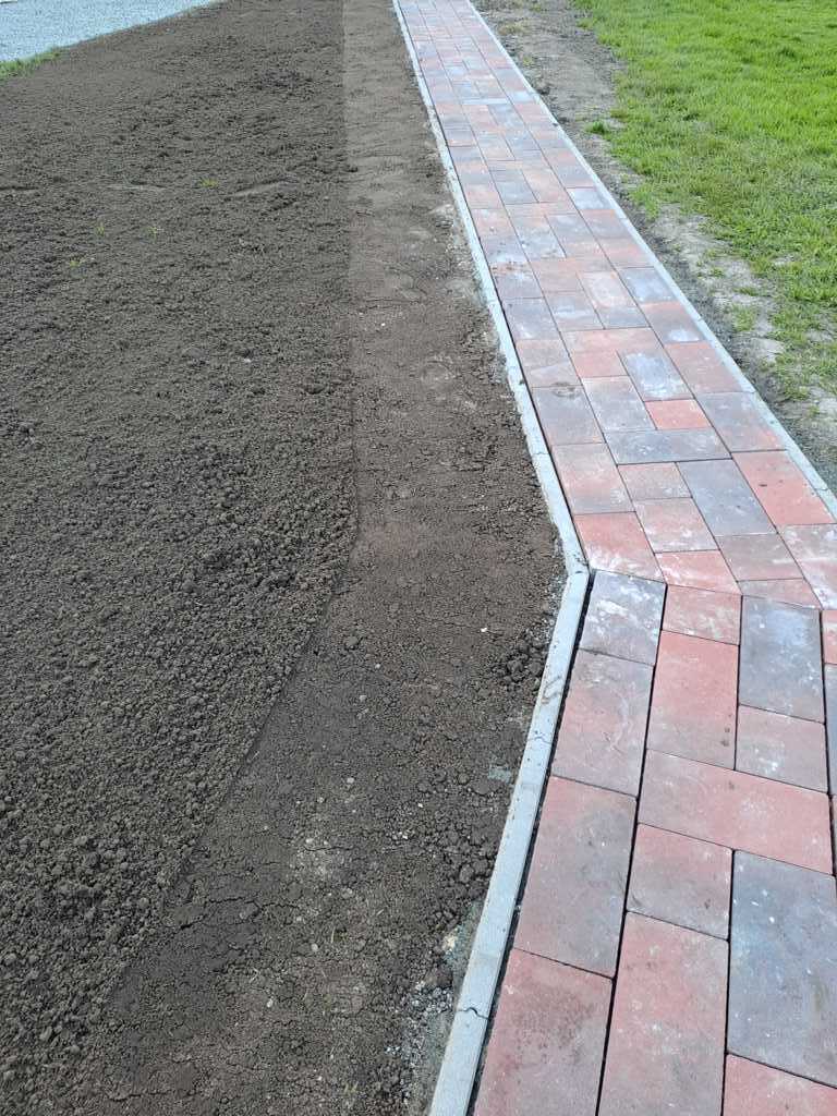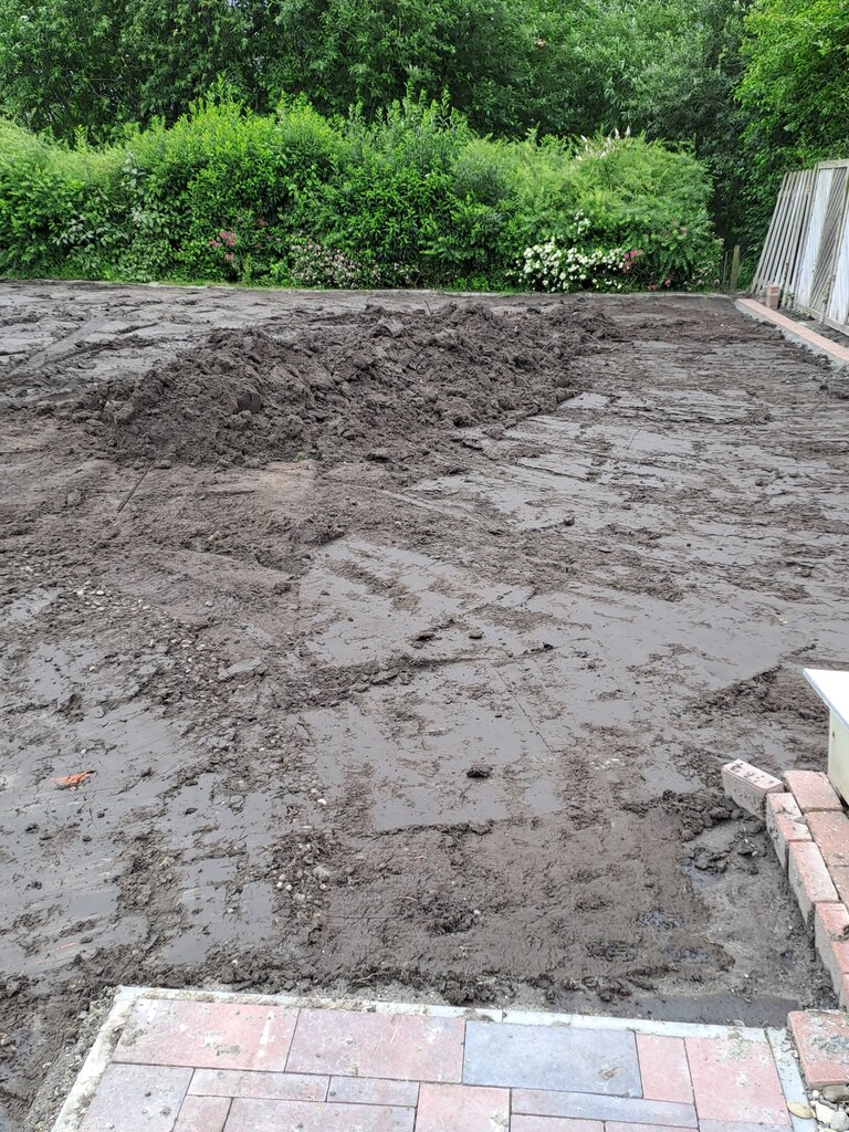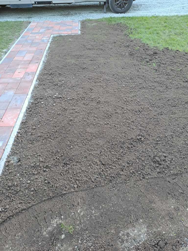 Da die neue Zuwegung zur Garage und zum Wohnmobil höher als die alte Zuwegung liegt, musste Erde angefüllt werden, damit später der Rasenroboter über die Pflasterung fahren kann um auch dahinter die Rasenfläche zu mähen.
