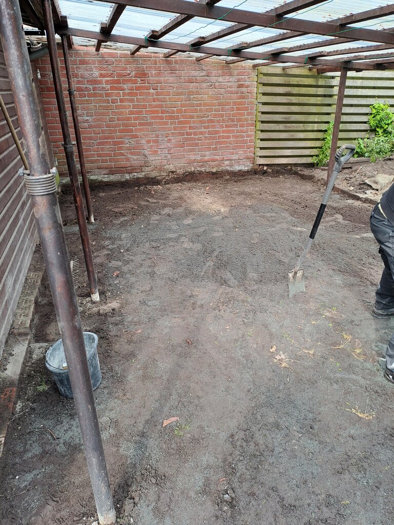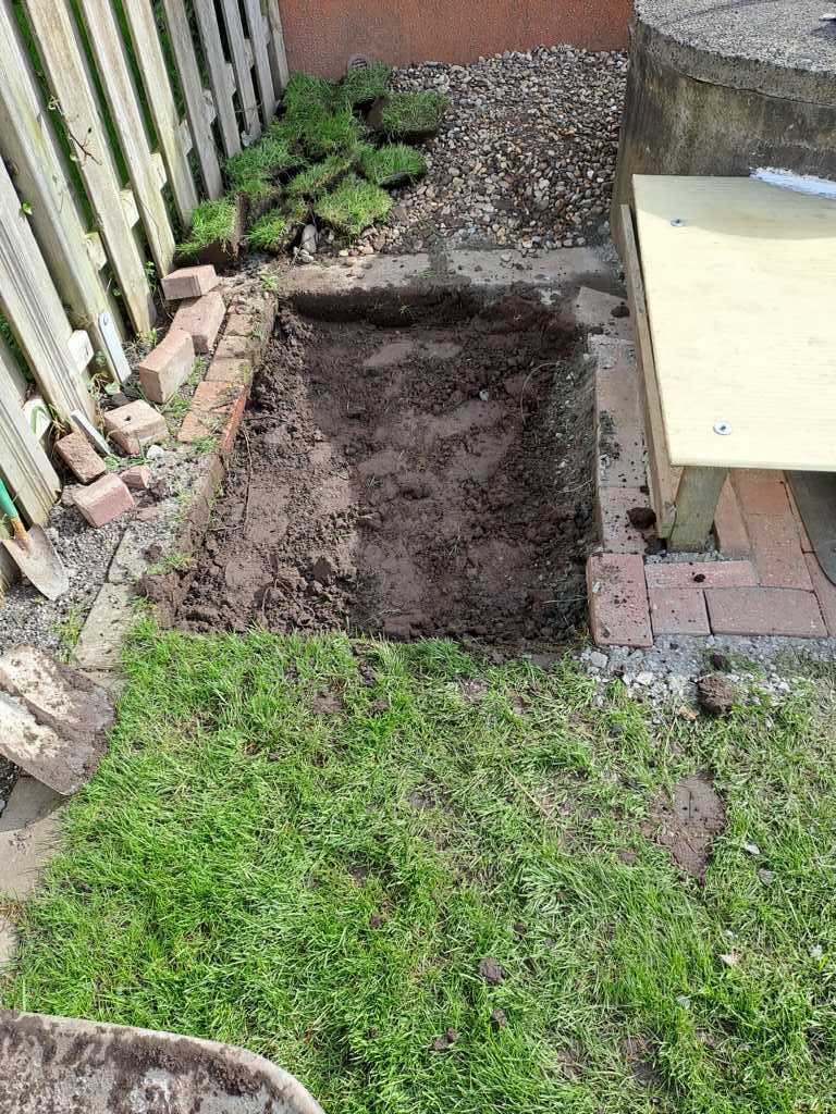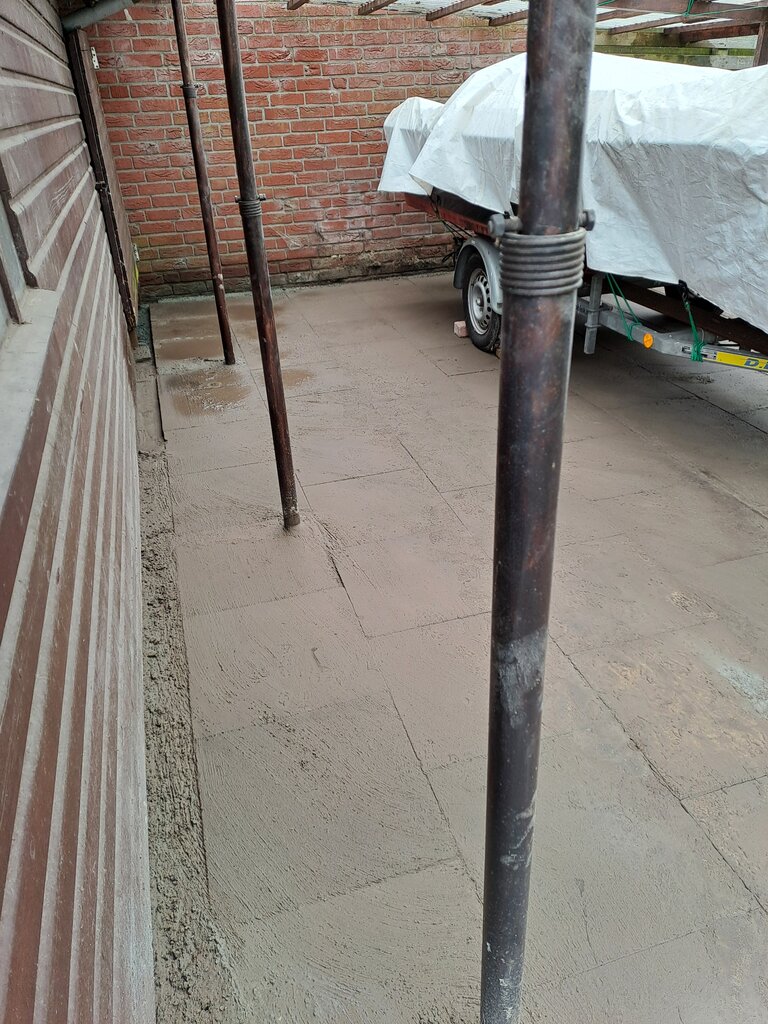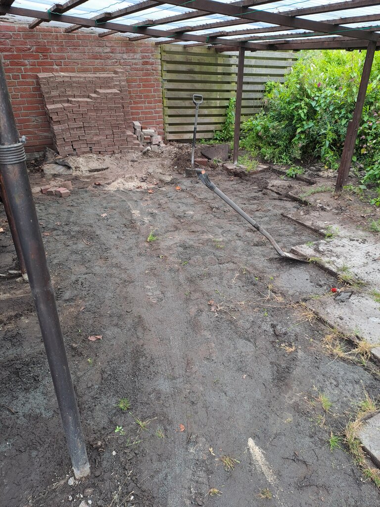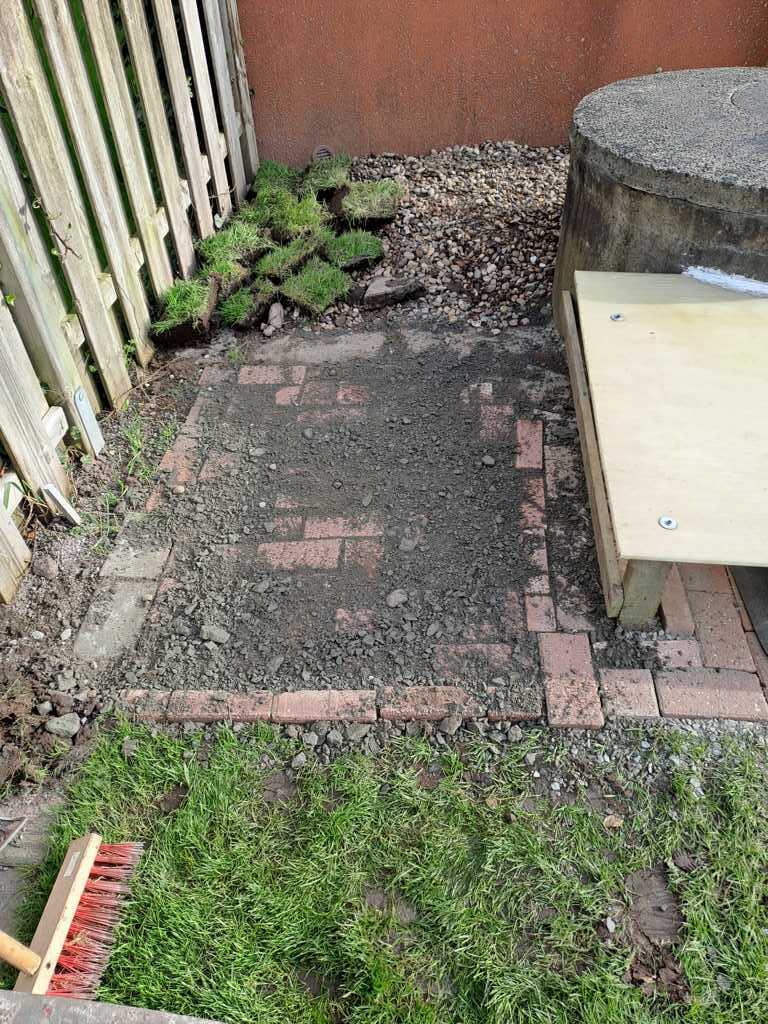 Hinter dem Gartenhaus war die Pflasterung für einen Anhängerstellplatz teilweise versackt. Diese ist jetzt aufgenommen worden und neu verlegt.
