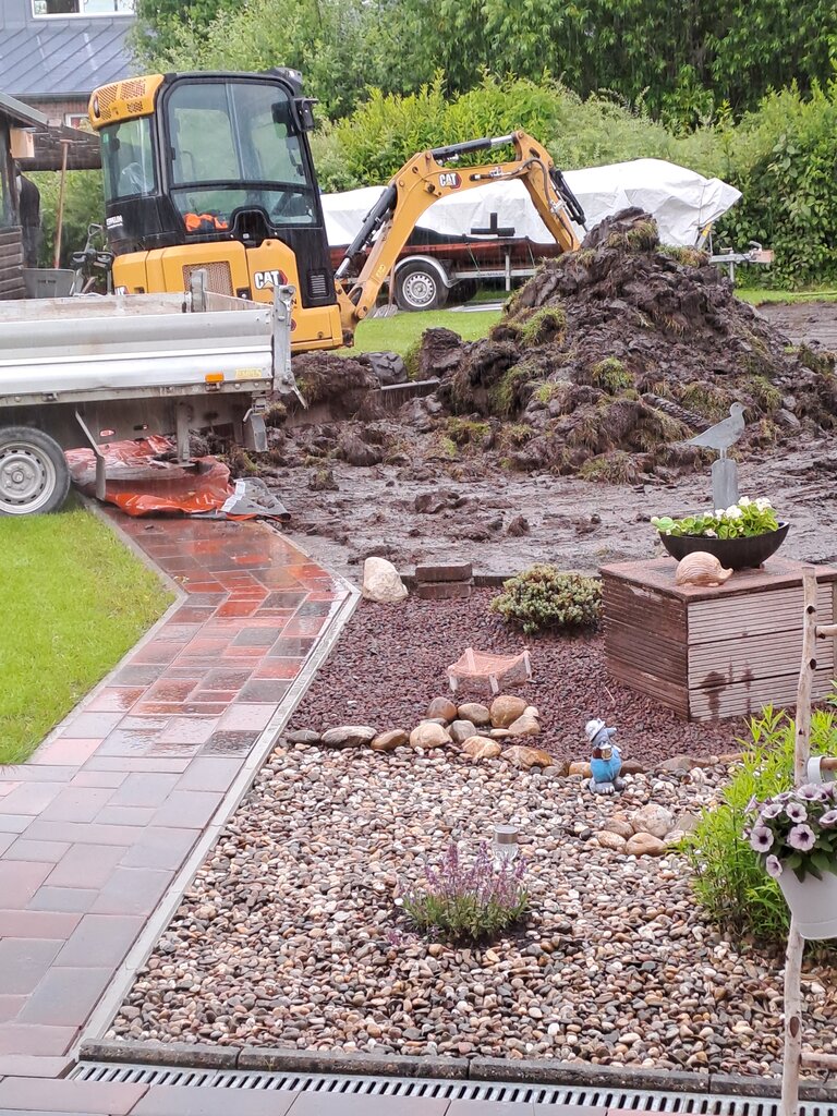 Der Rasen wird komplett abgeschält. Dann wird die Fläche mit leichtem Gefälle versehen und danach mit einem Maulwurfsperrgitter belegt. Erde drauf und Grassaat drin, fertig wird die neue Fläche. Eine Rasenmähkante wird ebenfalls verlegt. Firma Baudima aus Hinte ist auch für diese Arbeiten sehr gut.