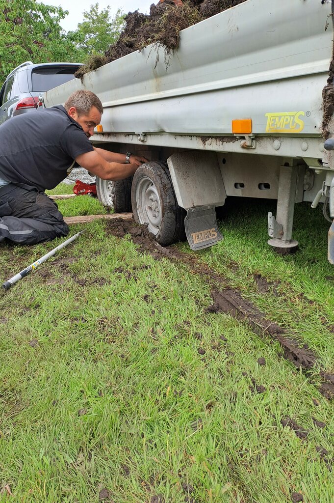 Heute wollte Firma Baudima Zeit sparen und lud den Anhänger zum Abtransport der Grasnarbe zu voll. Prompt versackte dieser.