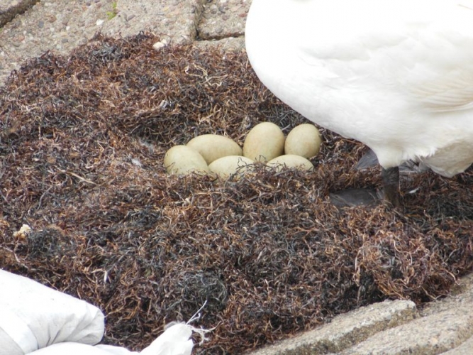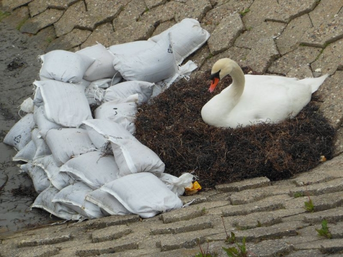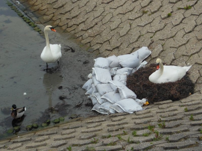 Reges Treiben herrschte, weil gerade eine Segelwettfahrt beendet war. Jugendliche verschiedener Nationen waren damit beschäftigt ihre Boote wieder an Land zu lagern. In einer Ecke der Hafenanlage entdeckten wir ein Schwanennest. Dieses ist mit Sandsäcke geschützt worden. Die Schwäne ließen sich von den vielen Besuchern nicht stören. Wir hatten Glück, das Nest mit den Eiern auch ohne brütenden Schwan fotografieren zu können, weil dieser sich gerade putzte.
