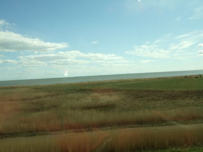 Nachdem wir uns einige Zeit den frischen Wind um die Ohren haben wehen lassen, war ein wärmender Kaffee angesagt, bevor es wieder mit der Bahn zurück nach Husum ging. Jetzt war auch das Wasser beiderseits des für uns erstaunlich breiten Dammes nach Sylt wieder zurückgekehrt. Hier Bilder aus dem fahrenden Zug gemacht.