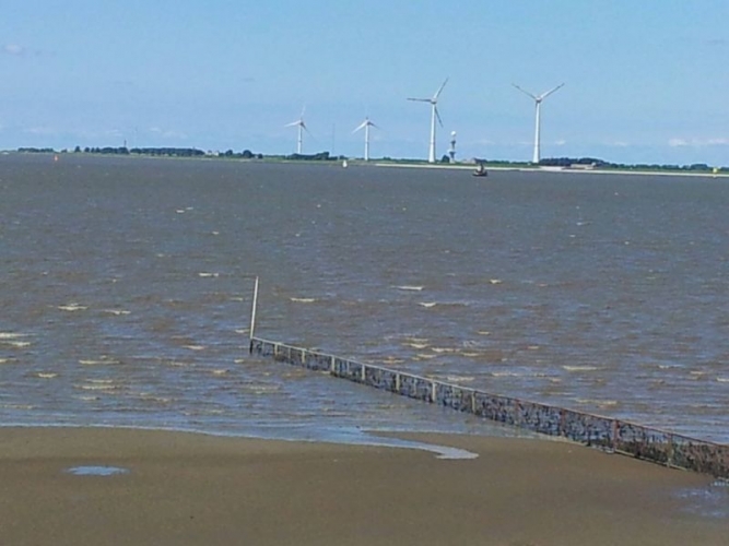 Fast direkt gegenüber dem Eingang zum Platz befindet sich ein Deichübergang und man ist dann sofort an der Emsmündung, dem Dollard. Von dort aus kann man auf der anderen Seite die Knock nebst den Windgeneratoren sehen.Hier noch ein Blick auf den Platz vom Deich aus.Auf dem Deich erreicht man nach kurzem Spazierweg die Hafeneinfahrt Termunterzijl.