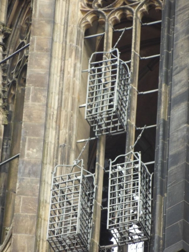 Am Turm der alten Marktkirche St. Lamberti hängen noch die drei Käfige, in denen 1536 die Leichen der Wiedertäufer als Abschreckung zur Schau gestellt wurden.