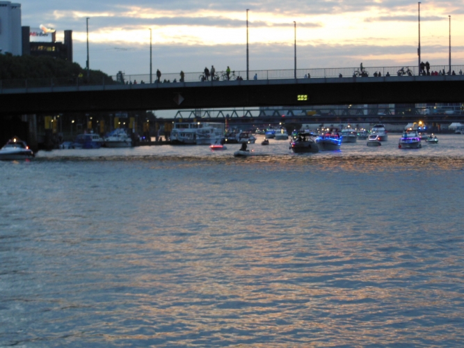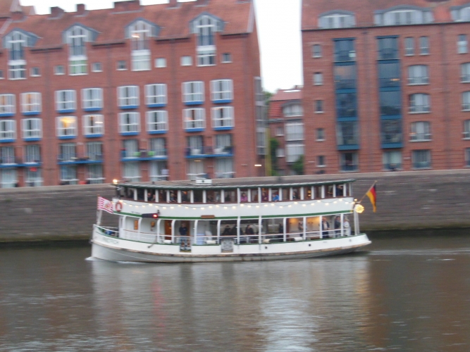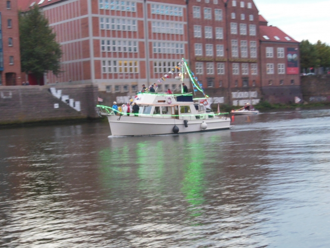 Vermutlich sind wir durch unsere langjährige Bootsfahrerzeit, insbesondere durch die Gondelfahrten in Appingedam und der Lampionfahrt zum Leeraner Gallimarkt, schon verwöhnt. Wir konnten der Lampionfahrt in Bremen nichts abgewinnen. Die Boote waren entweder gar nicht oder nur lieblos geschmückt. Die wenigen Beleuchtungen, die zusätzlich zur vorschriftsmäßigen Bootsbeleuchtung montiert waren, ließen bei uns keine Stimmung aufkommen.