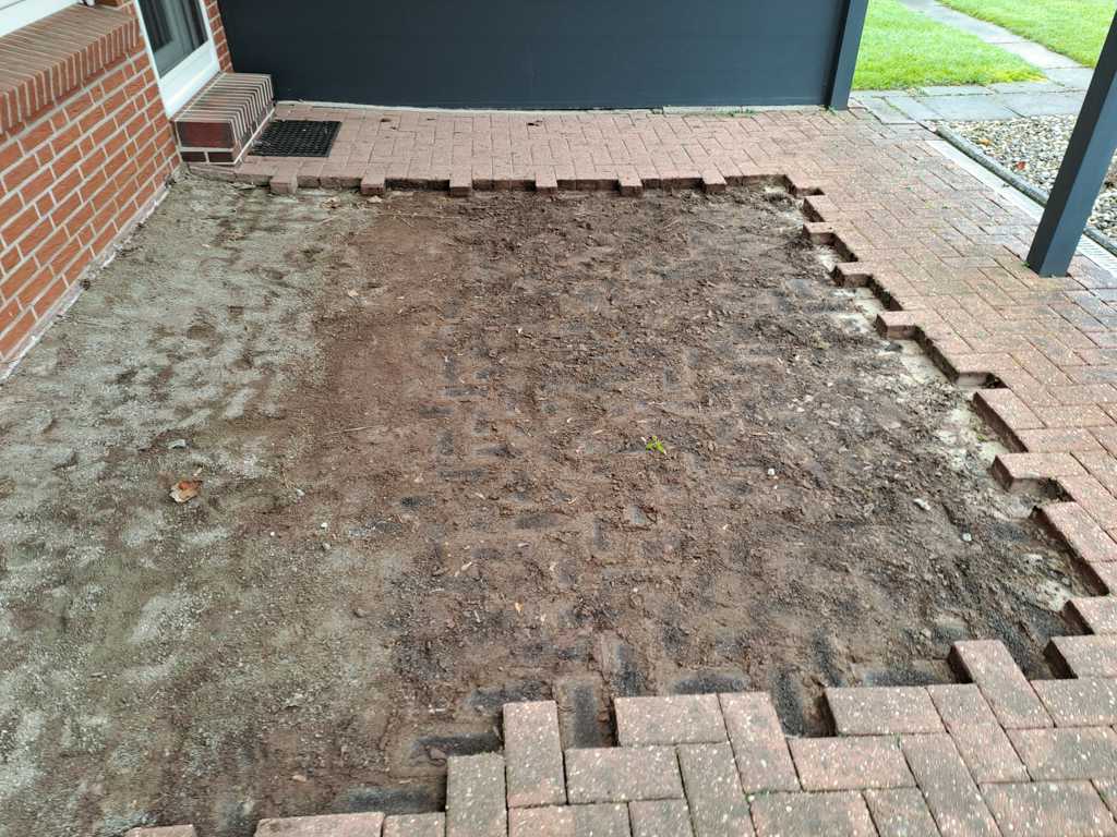 Die noch einigermaßen zu benutzenden Steine (unter der Terrassenüberdachung) nahm ich selber auf, um sie erst einmal zwischen zu lagern.
