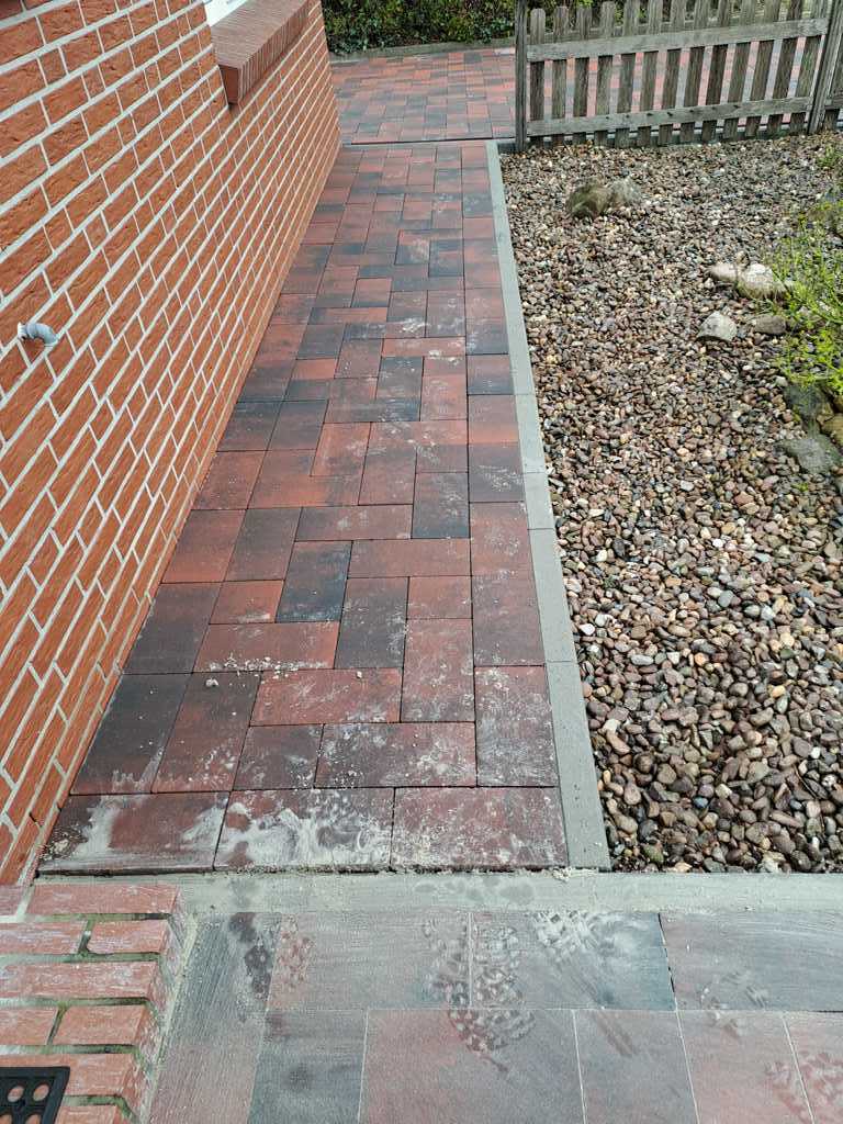 Auch wurde die Höhe der Zuwegung zur Haustür so angepaßt, daß es nicht mehr so eine hohe Trittstufe vor der Haustür -wie vorher- gab. Alle weiterführenden Pflasterungen wurde an diese neue Höhe angepaßt. Auch hier hat die Firma Baudima GmbH mitgedacht. SUPER