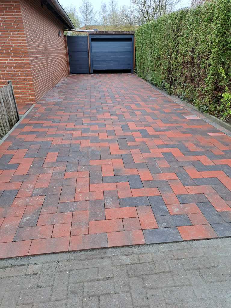 Im letzten Bild kann man erkennen, das es -im Fachjargon Läufer genannt- eine Pflasterreihe entlang der Grundstücksgrenze gibt, die etwas tiefer liegt. Diese dient dem Regenwasserablauf. Die gesamte Fläche ist mit entsprechendem Gefälle gepflastert. Auch eine gute Idee
